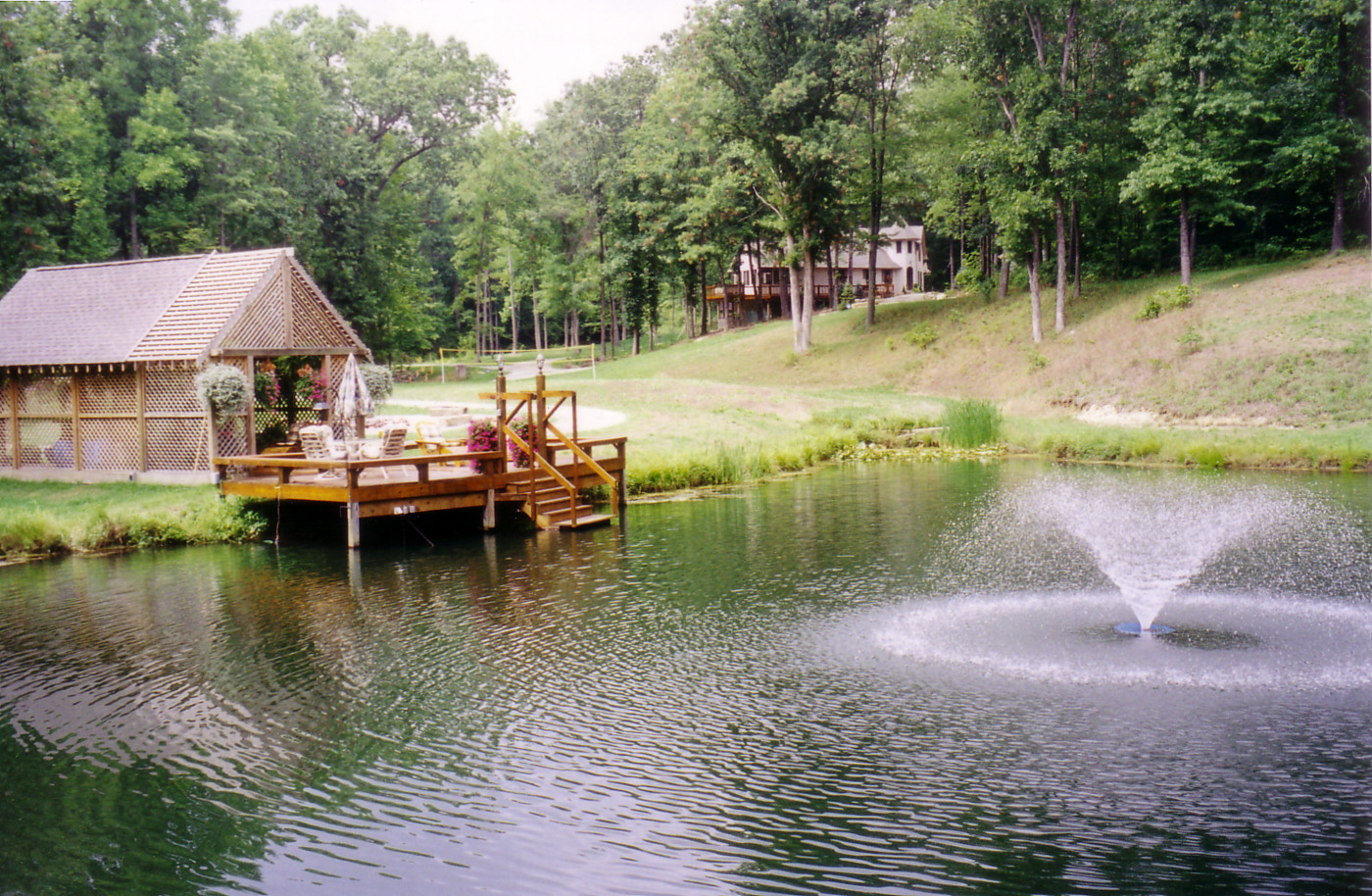 The summer following the construction of the pond deck my tenant/carpenter living in the farmhouse and I built the pond gazebo. It took us 2 weeks to complete. I trenched electric from our house (almost 500’) to the gazebo thus allowing for lighting and ceiling fans. The gazebo is 30’ long and roughly 12’ wide with a gable roof over 2/3 of the structure and lattice over the balance. The lattice gable allows dappled light to penetrate the structure making for the perfect environment for the huge ferns we hang in the spring and summer. The interior of the gazebo has a tiled 2-tier bar and is a favorite spot for our guests to enjoy a sunset cocktail. Next to the bar I constructed a large stone barbecue. We first used the barbecue in the spring of 2003 while hosting a picnic to celebrate Keith’s graduation from Ohio University. The grill can easily accommodate 50 burgers at a time and today serves as a favorite gathering place for families that enjoy picnicking at the pond.