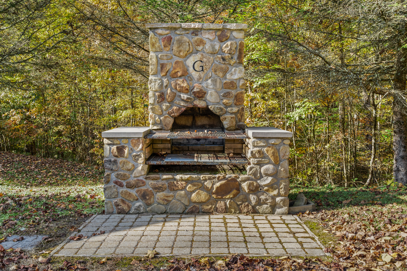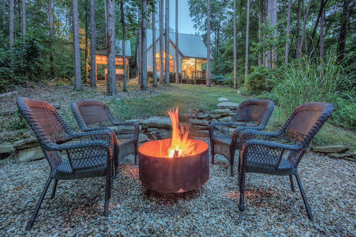 If the exterior of the cabin had to have the “Wow Factor” than the inside needed to make you feel like “Oh my God, this is Amazing”. As you enter the cabin from a large covered dining porch your eyes are greeted with 16’ high spaces - a gourmet kitchen on the left with an island bar separating it from a great room with boulder fireplace on the right. The kitchen has quartz countertops, maple cabinetry and everything imaginable to prepare any sort of gourmet fare. The great room has 2 story windows that overlook the fire pit and deep ravine beyond. Floors are large plank pine and all doors and windows are cased with knotty pine.