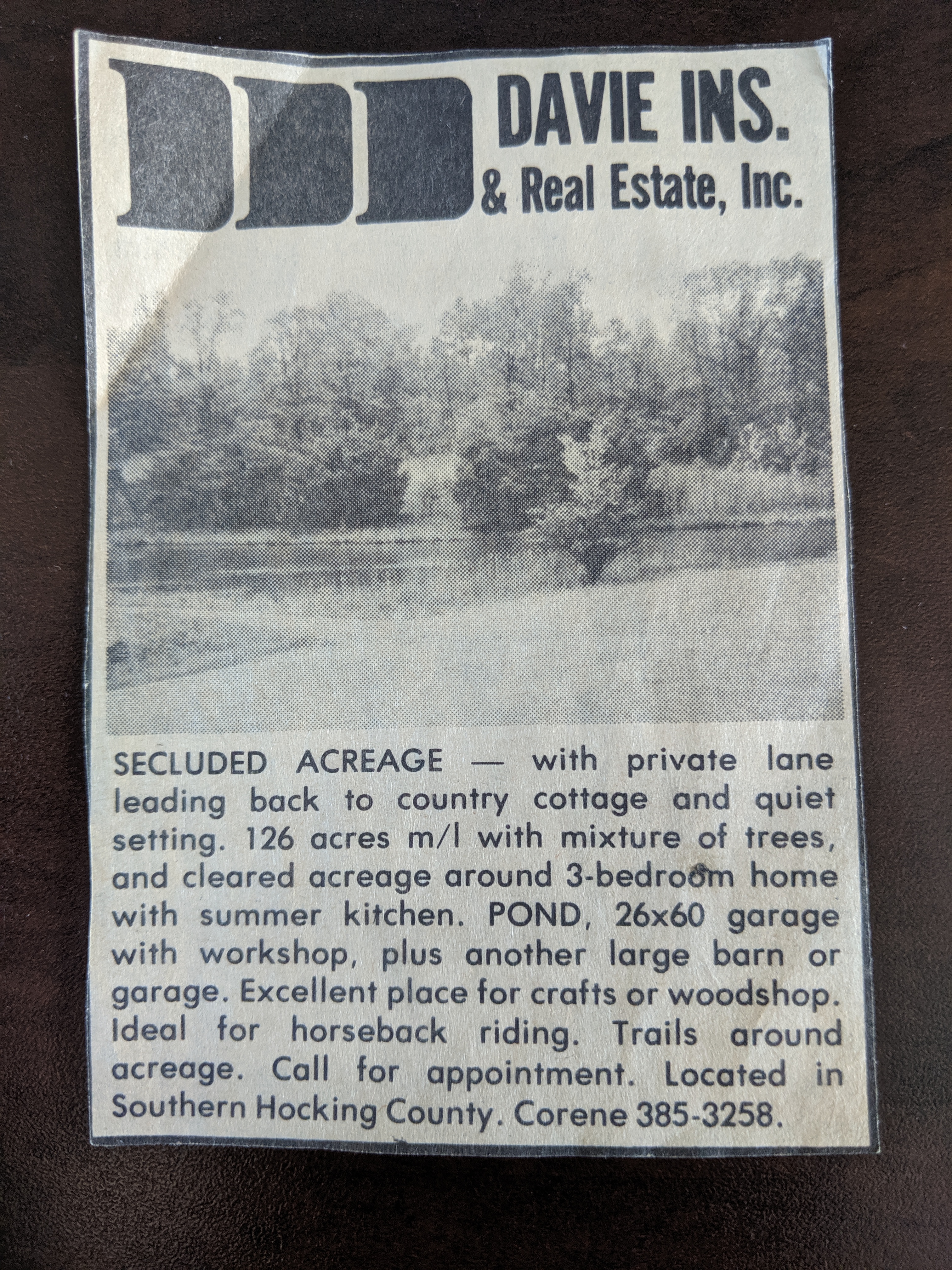 The story begins when a close personal friend of mine told me about property for sale in the Hocking Hills Region of SE Ohio. He saw an ad in the newspaper – Farm 4-Sale and invited me to go with him to look at the property.
