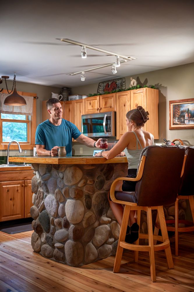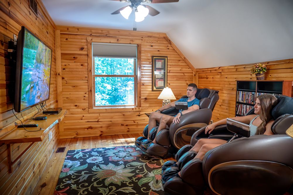 The Oak Ridge Luxury Cabin welcomes you with wide-plank wood floors, cathedral ceilings, picture windows, and stylish yet comfortable seating. Enjoy the sights and sounds of nature as you wine-and-dine in the open-plan, gourmet kitchen. A stone-lined, see-through, gas-log fireplace creates a striking, architectural statement—dividing the family room and master bedroom. While upstairs, two zero-gravity massage chairs and a large flat-screen TV with deluxe sound system await to create the utmost in-cabin theater and relaxation experience.