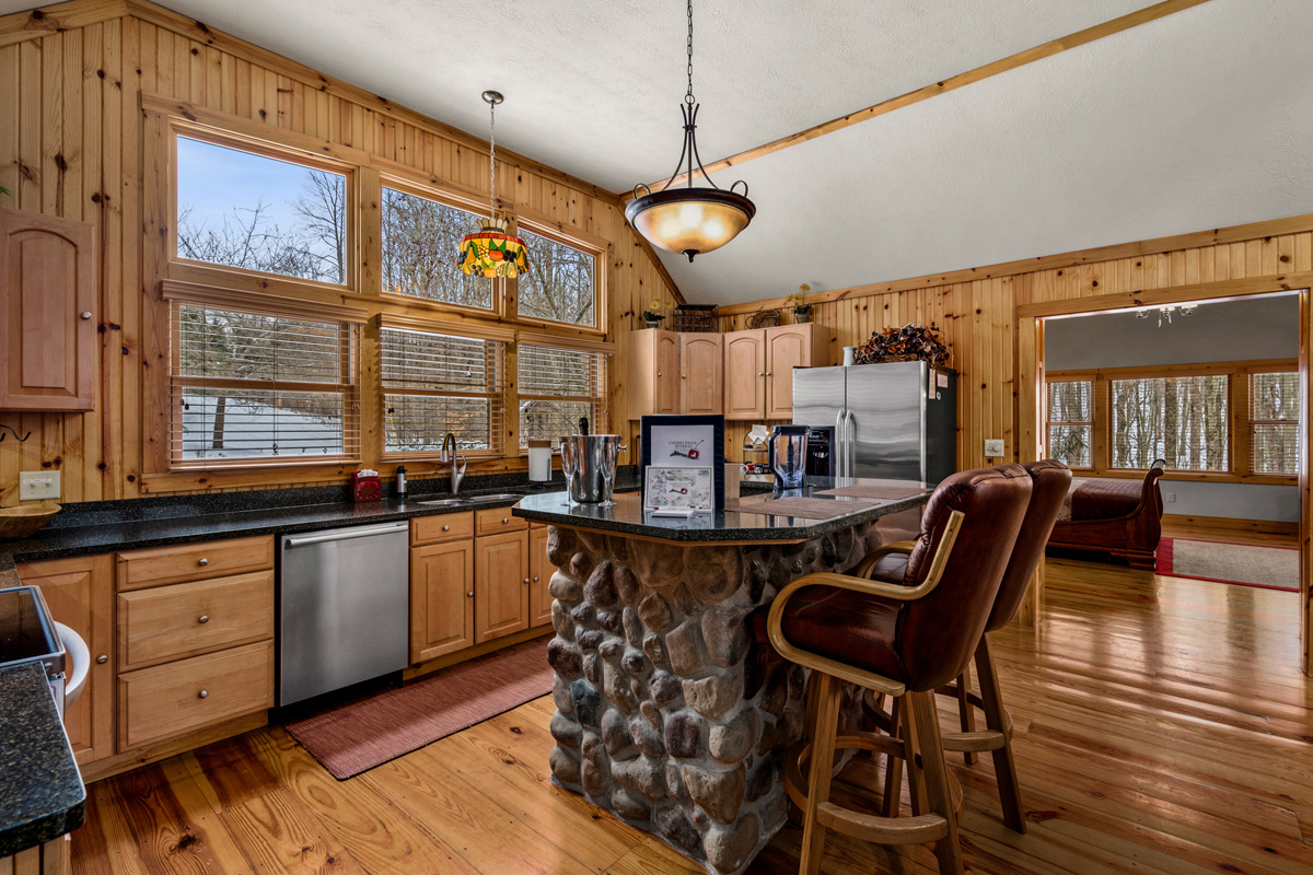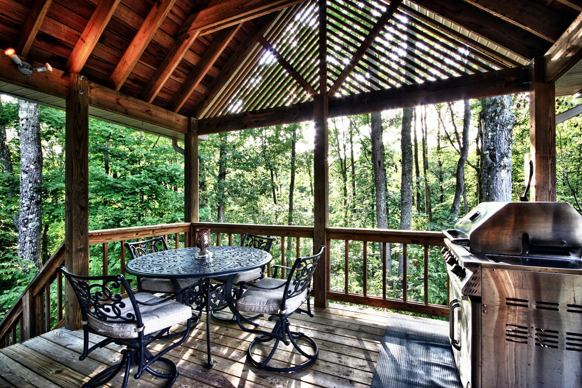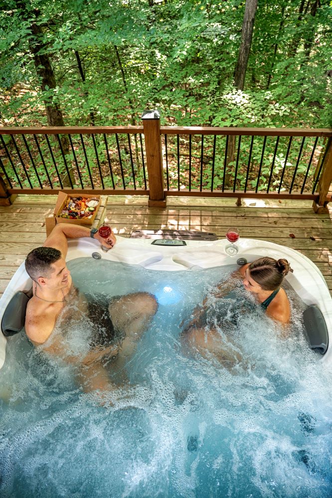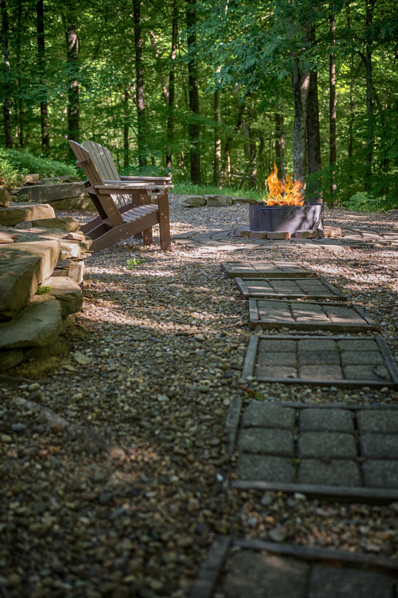 Nestled at the top of a private drive in Hocking Hills is the striking Ravine’s Edge Luxury Cabin. Its rich stone and stucco facade and picturesque front porch overlooks scenic landscapes and breathtaking views. Just steps out the back is a newly renovated outdoor living space with private fire pit (view firewood packages*) that overlooks the lush forests of Hocking Hills and access to private hiking paths and 140+ forested acres of serene woodland trails (trail maps included). Melt away the stresses of the day in your private, gazebo with outdoor fireplace and deluxe, three-person jacuzzi hot tub.