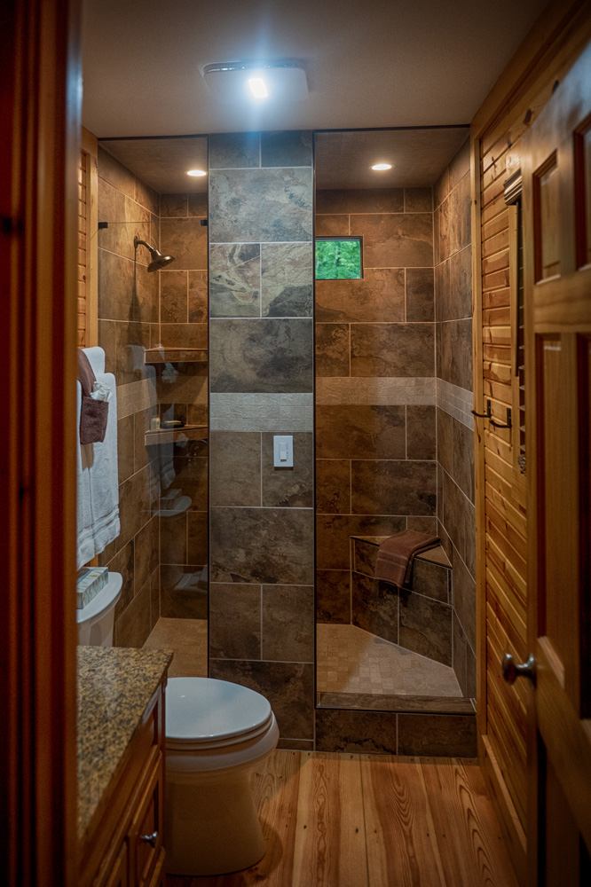 Absolute attention to every minor detail has been built into Still Waters Luxury Cabin. Featuring a spacious, open-plan kitchen, artist designed furniture, large cathedral ceilings, and oversized windows, this deluxe cabin assures you one of the finest vacation experiences possible. Both bedrooms offer exquisite, woodland views, and the master bedroom includes a king-size bed and two-sided, see-through gas-log fireplace. Designed with indulgence in mind, the newly renovated bathroom shower is built for two and features four shower heads.