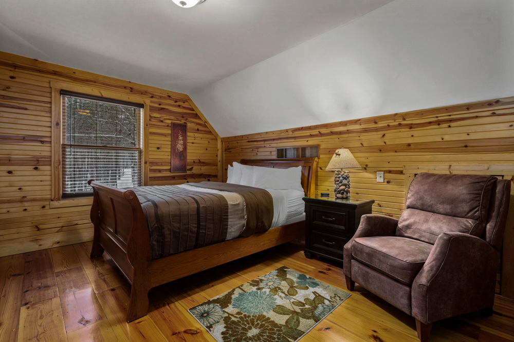 - Two-bedroom cabin: King bed downstairs; queen bed upstairs