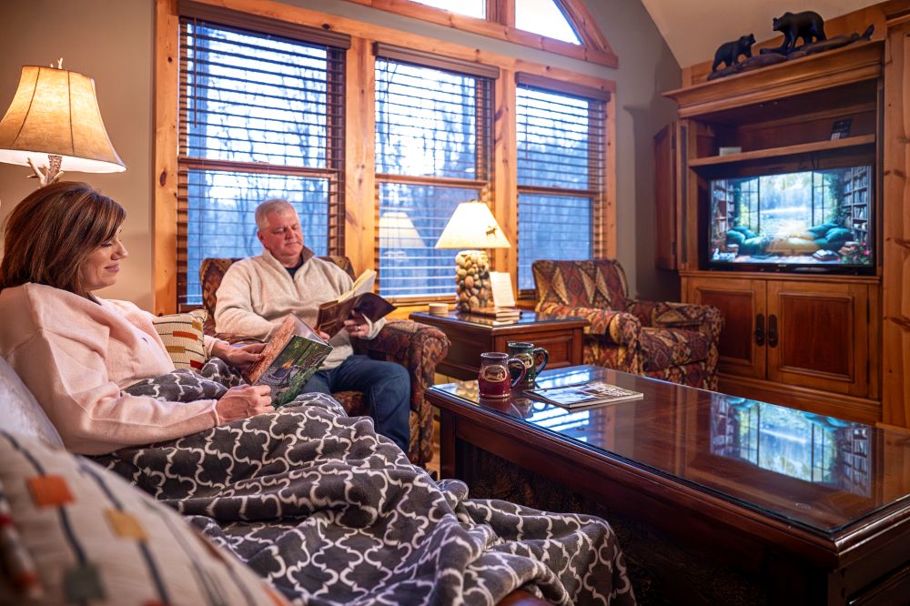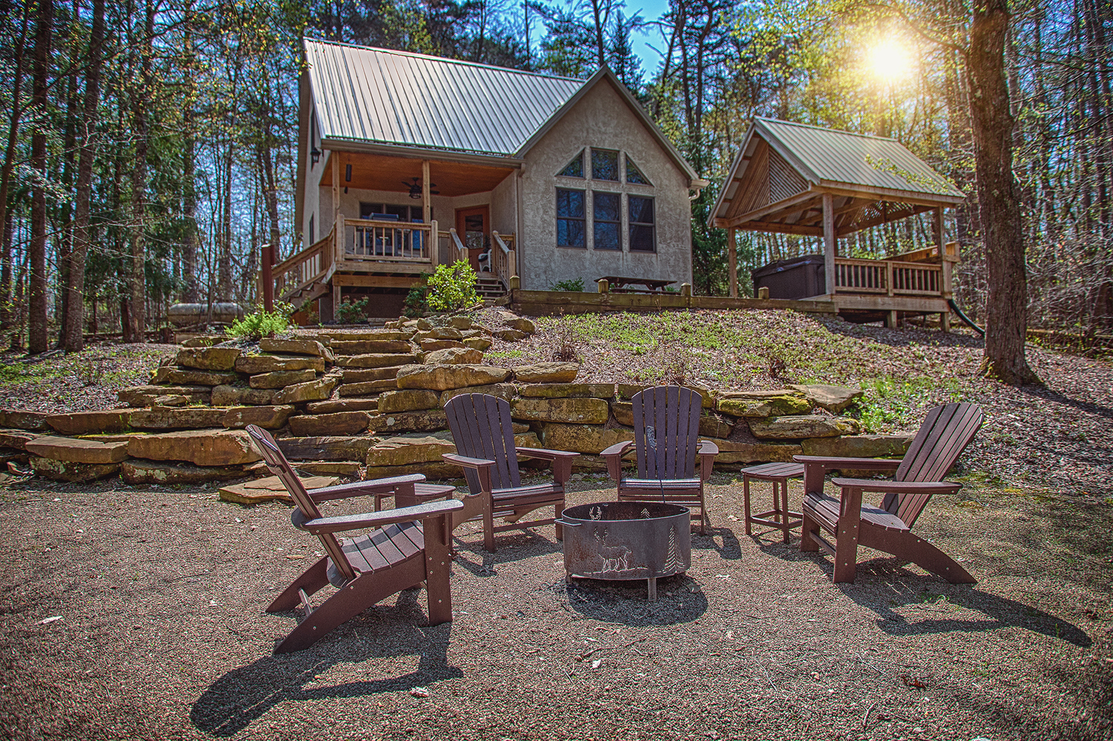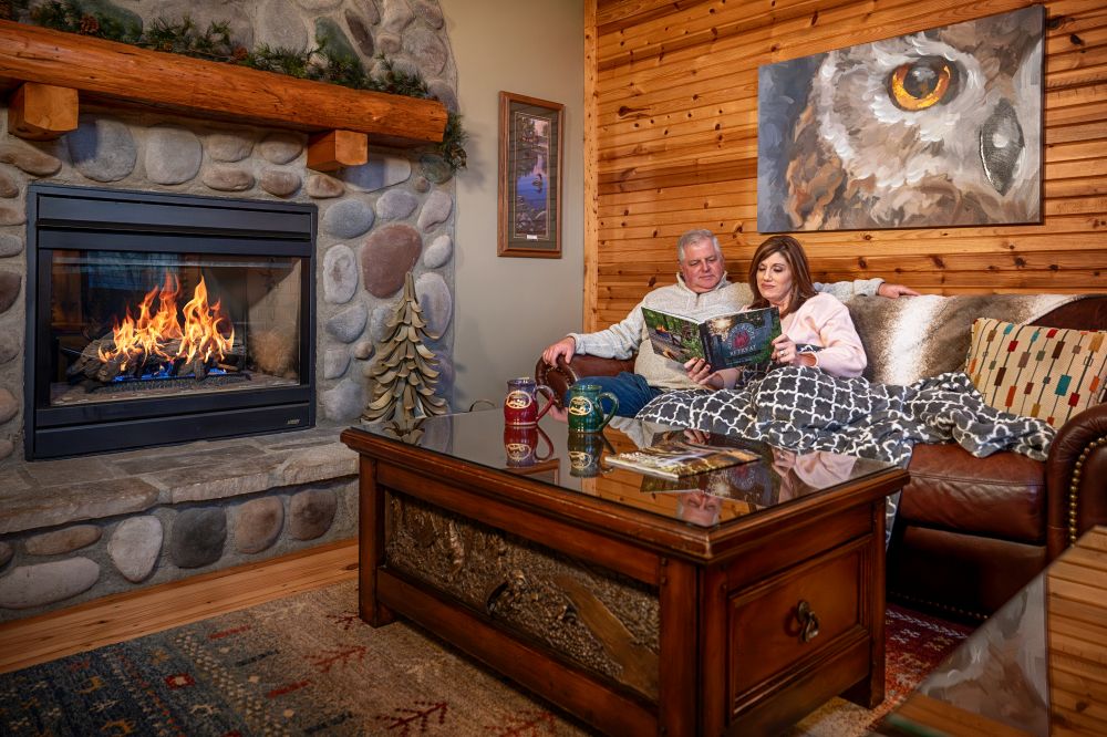 Set along the same picturesque pond as Water’s Edge, Still Waters features a terraced stone pathway that descends to a fire pit with a unique, natural rock wall backdrop. It sleeps up to four and features a private gazebo with deluxe four-person hot tub, newly renovated bathroom with two-person shower, king-size master bedroom with stunning double-sided glass fireplace, and remarkable views of the picturesque central pond.
