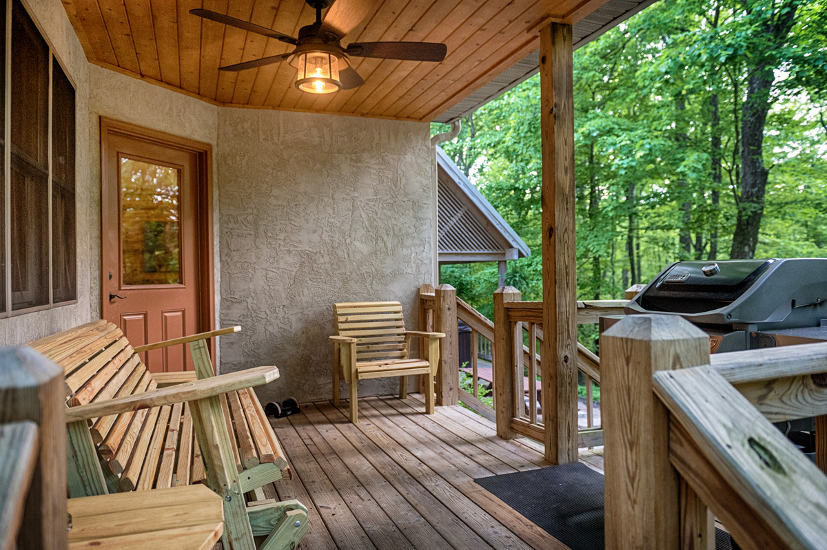 - Attached, covered porch with seating area and stainless-steel gas grill (propane included)