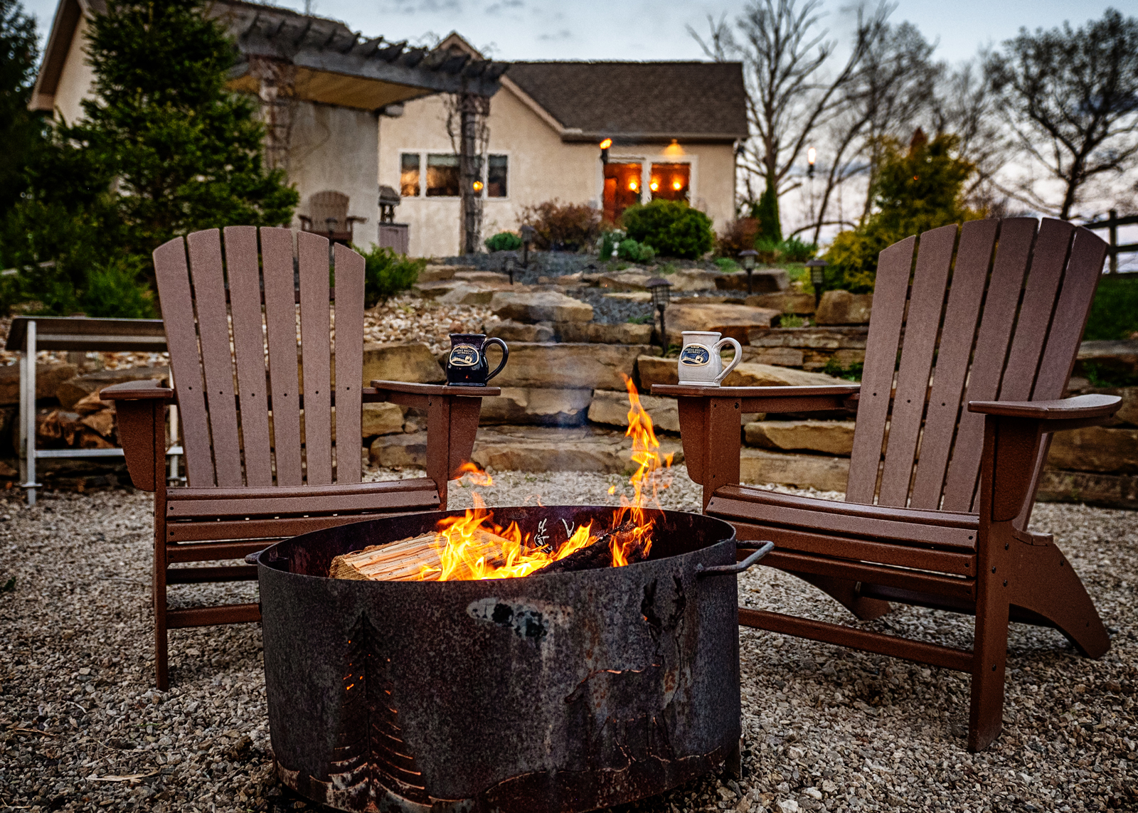 Perched atop a lush hill in the woods of Hocking Hills is the illustrious and private Observatory Luxury Cabin. Enjoy breathtaking views of wildlife and unparalleled stargazing from a secluded poolside deck. A jacuzzi hot tub is conveniently located next to a fully-tiled bathroom suite and just steps away from a year-round sunken cold plunge and seasonal in-ground heated swimming pool. A stone, terraced hillside with recessed, wood-burning fire pit (wood available for purchase) and Adirondack chairs help to complete your quest for relaxation and renewal.