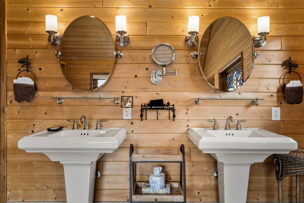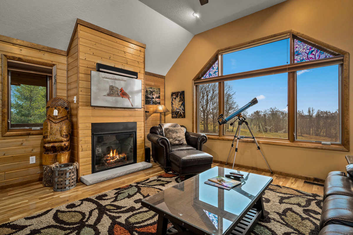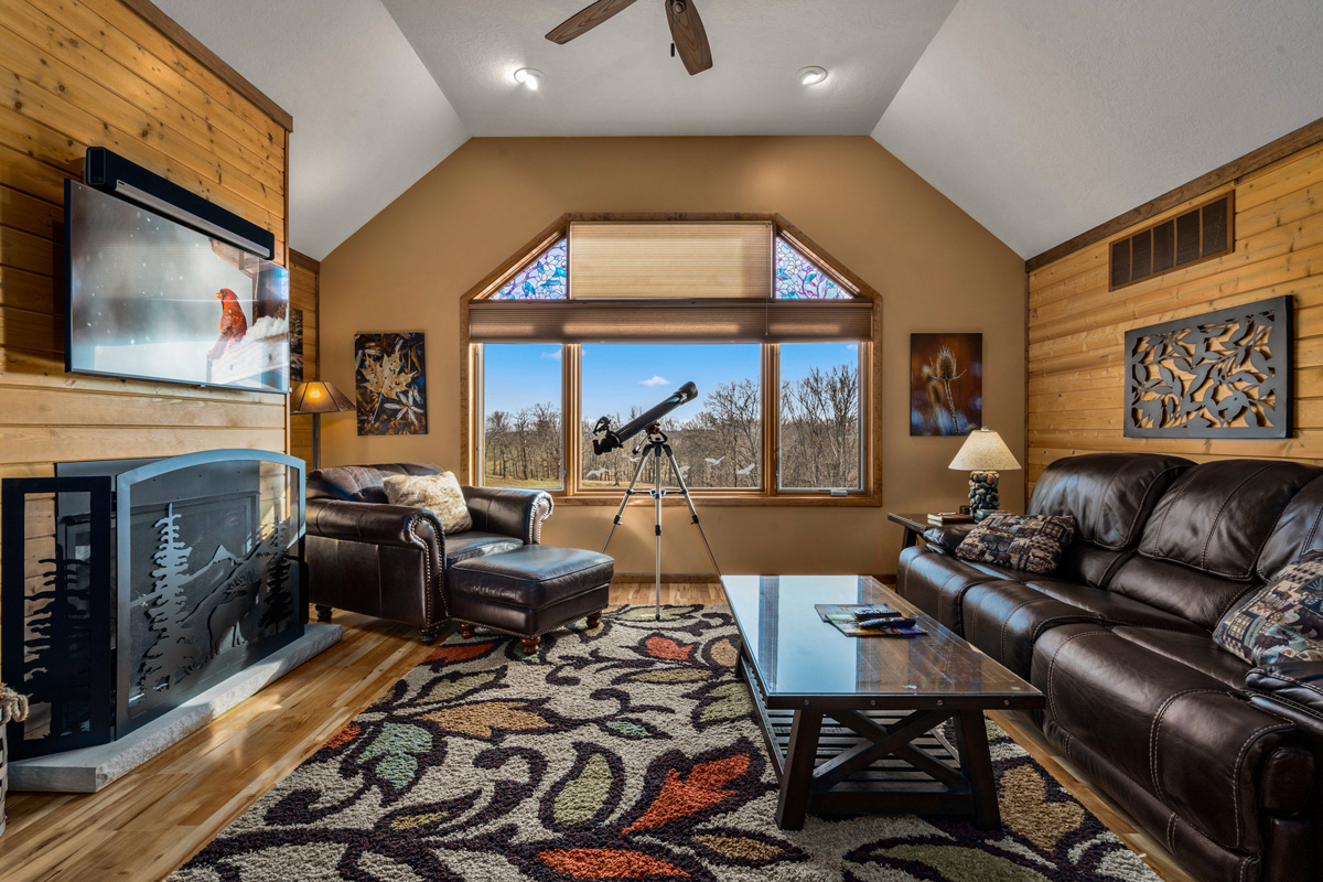 The open-plan interior of the Observatory provides direct access to a gourmet kitchen with state-of-the-art appliances and stainless-steel cookware. Its custom lighting accents rich cabinetry, beautiful quartz countertops, and a large pub. The oversized living room offers comfortable seating, a deluxe array of entertainment options, and a convenient, gas-log fire place. Vaulted ceilings and large expanses of glass bring you closer to your beautiful surroundings.