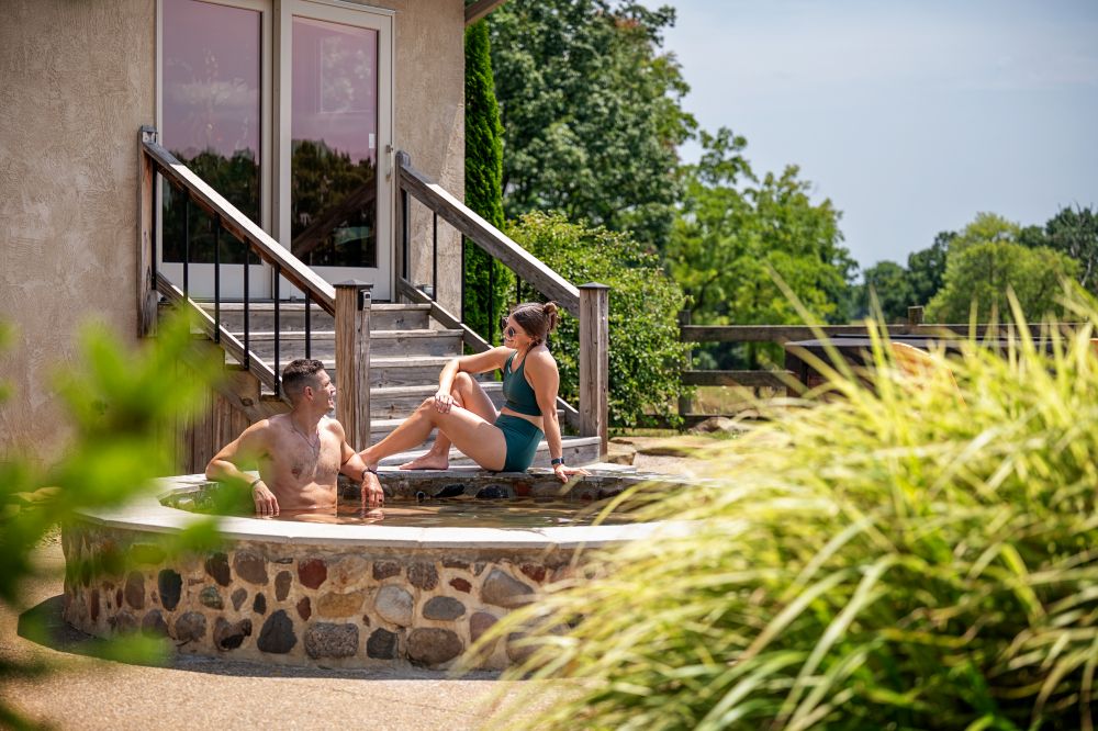 If your goal is to get away from it all while maintaining only the highest standards of luxury, look no further than The Observatory. A personal “spa in the woods,” this two-person cabin features generous living space, a private, seasonal swimming pool, jacuzzi hot tub, year-round cold plunge, and unique wet bathroom with stained glass.
