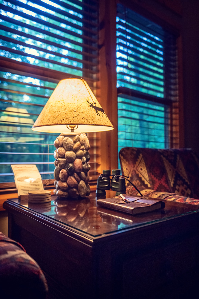 - Two-bedroom cabin: King bed downstairs; queen bed upstairs